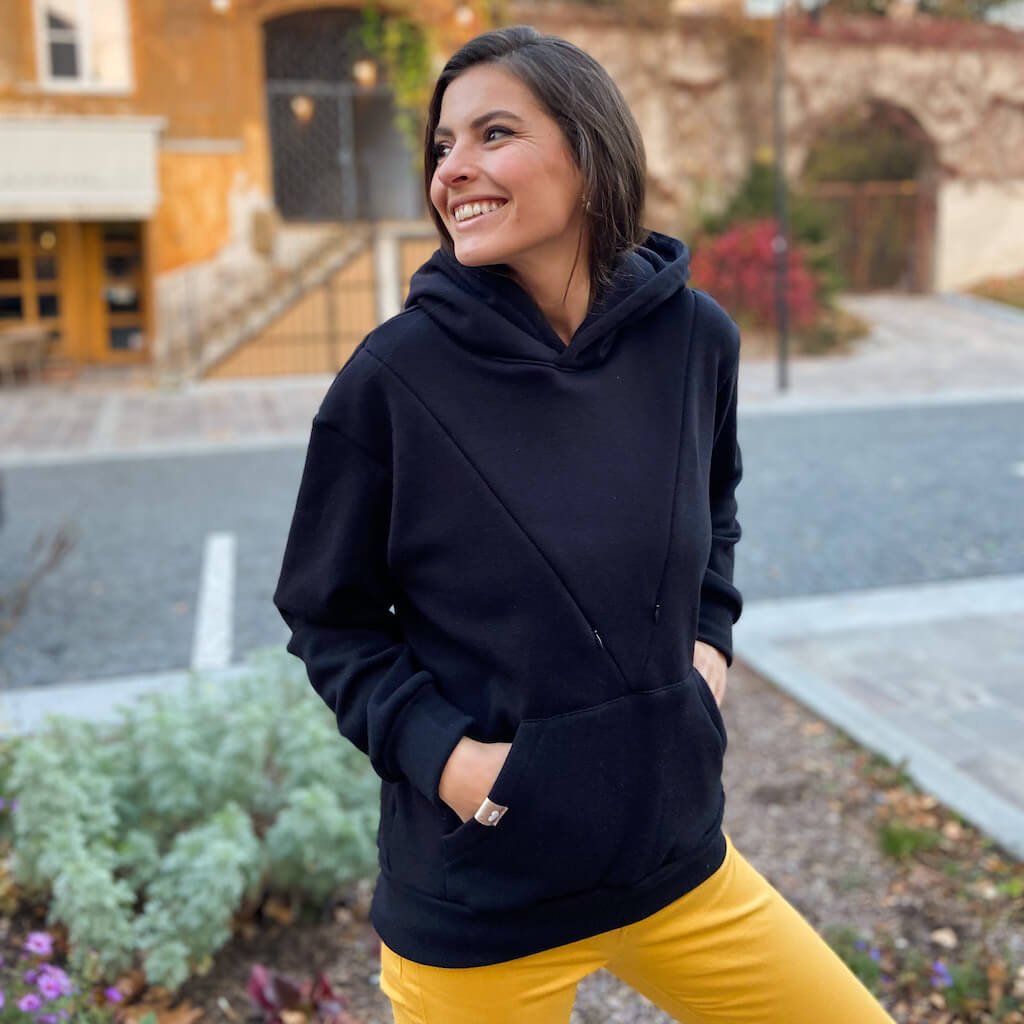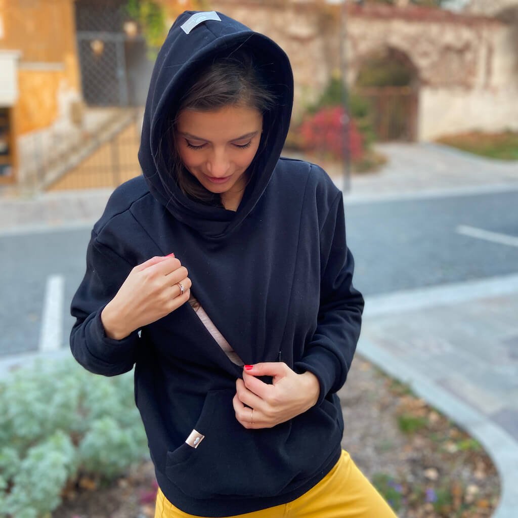 Akým spôsobom sa v mikine dojčí? Toto je Vaša najčastejšia otázka. Zips na mikine sa zipsuje zdola hore po šikmých líniách. Otvor si viete prispôsobovať podľa potreby.