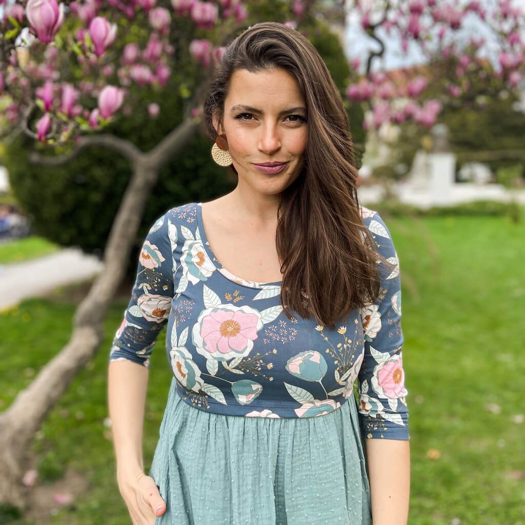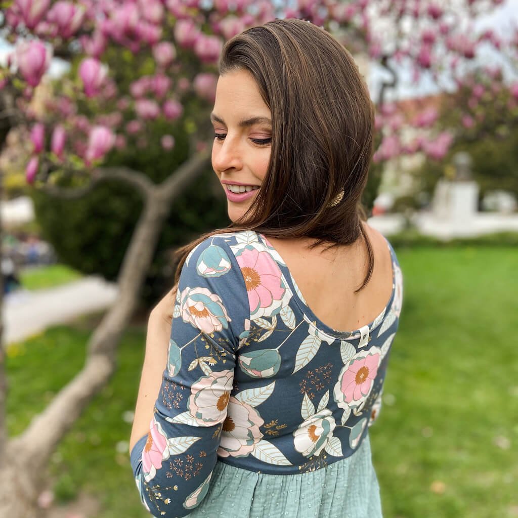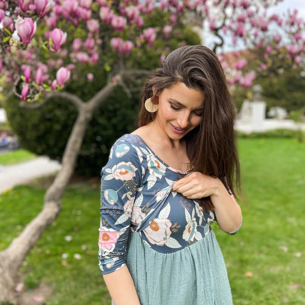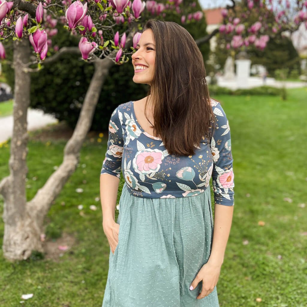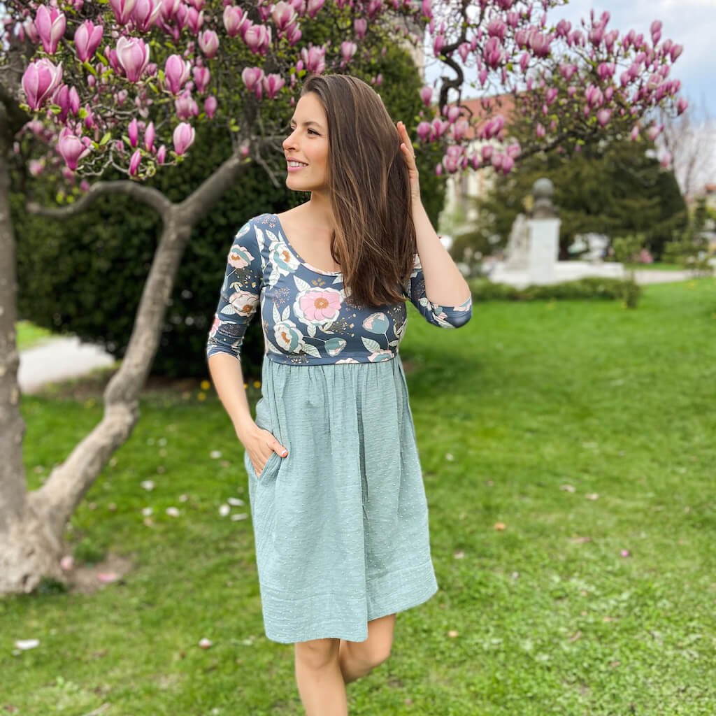 Letné šaty na ramienka s príjemnou ľahučkou mušelínovou sukňou. Vrchná časť je ušitá z bavlneného dizajnového úpletu. Šaty sú pod prsiami prestrihnuté a prispôsobené na dojčenie. Šaty sú vďaka voľnému strihu v časti bruška vhodné aj pre tehotné budúce mamičky.