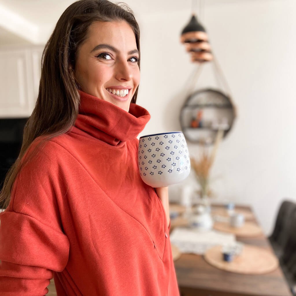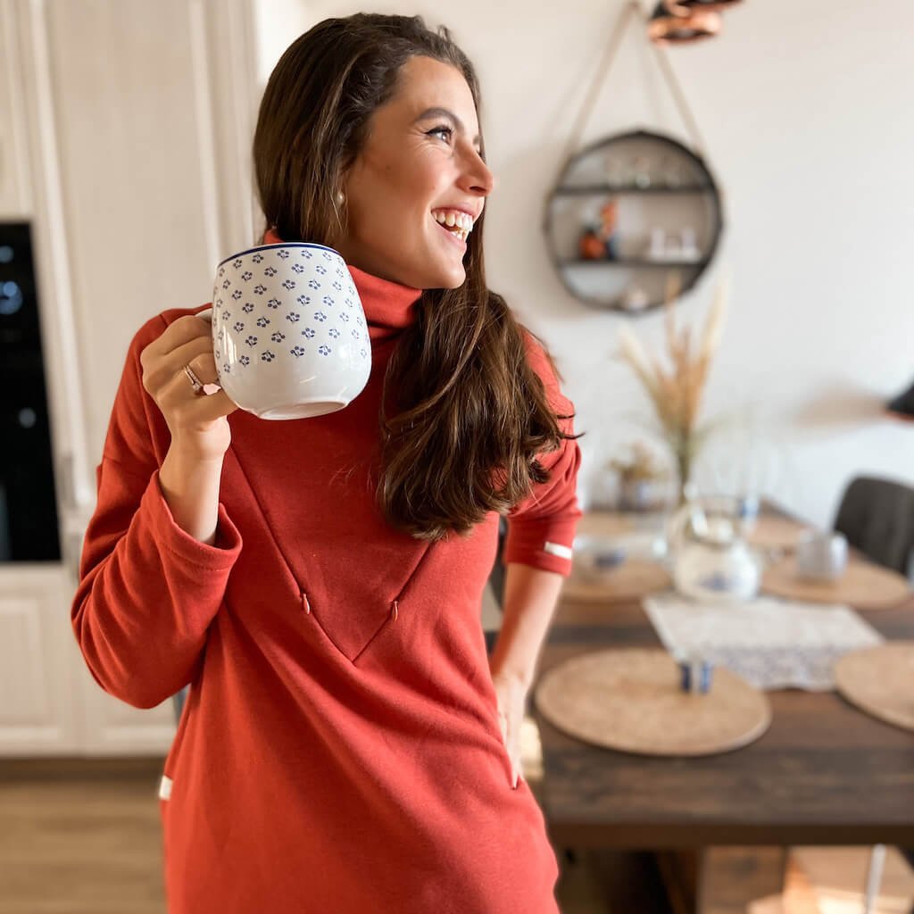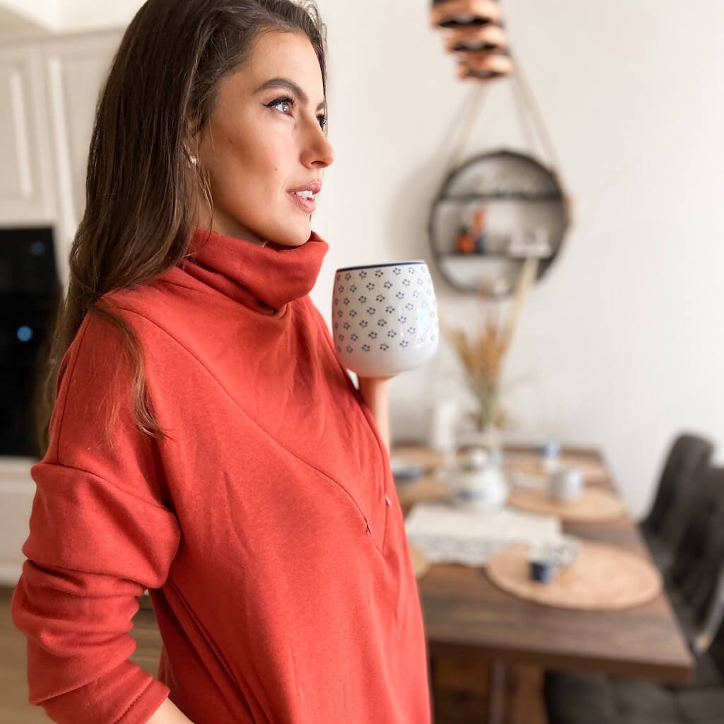 Rolákové šaty na dojčenie z príjemnej teplučkej teplákoviny. Šaty sú skvelou voľbou na jesenné a chladné zimné dni. Vďaka 2 skrytým zipsom bude dojčenie ešte jednoduchšie a pohodlnejšie. Materiál je dostatočne pružný a tak sa do nej zmestí aj tehotenské bruško. Mikina je vhodná aj pre nosiace mamičky, kedy aj pri dojčení ostane mamičkina hruď v teple. Šaty sú doladené elegantnou metalickou značkou s logom Mamiky.