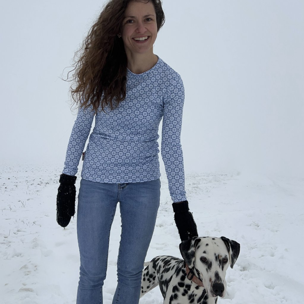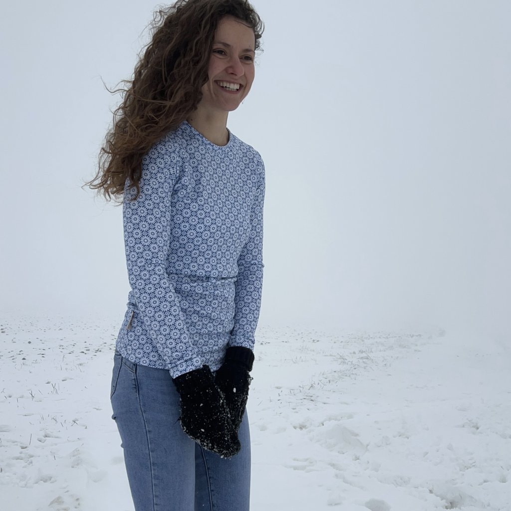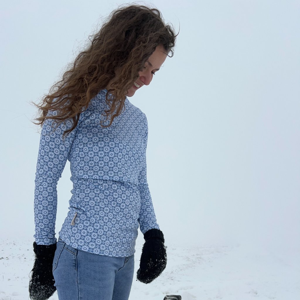 Tento kúsok šijeme v dojčiacej, alebo nedojčiacej verzii s rolákom, alebo bez. Dojčiaca verzia má nenápadný prestrih pod prsiami. Do spodnej časti kojo časti sme vložili jemnú tenučkú gumičku, aby lepšie držala svoj tvar.