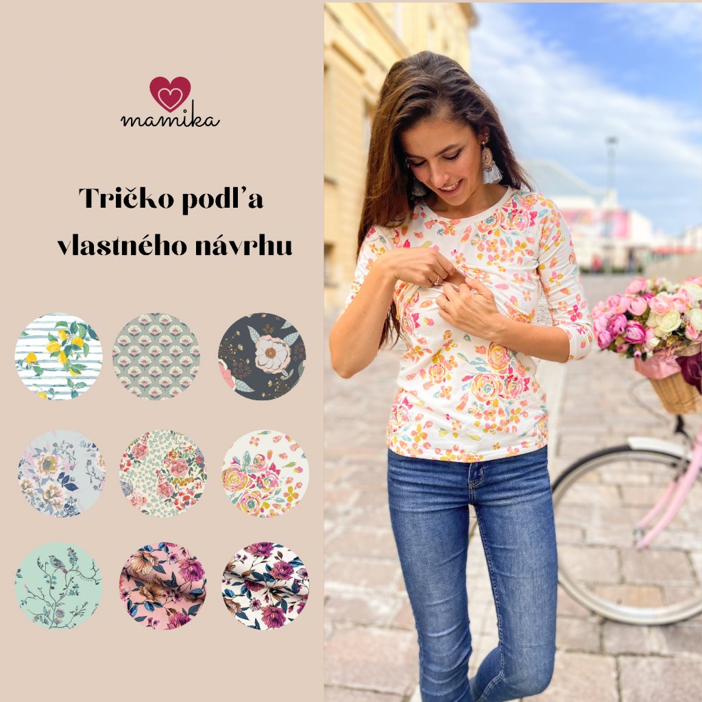 Poďte s nami tvoriť a navrhnite si svoje ideálne tričko! Na výber máte až z 9 krásnych kvetinových úpletov. Zvoliť si môžete typ rukáva, výstrih a veľkosť. Tričká šijeme prioritne v dojčiacej verzii. V prípade, že si želáte nedojčiacu verziu, napíšte nám to prosím do poznámky k objednávke.