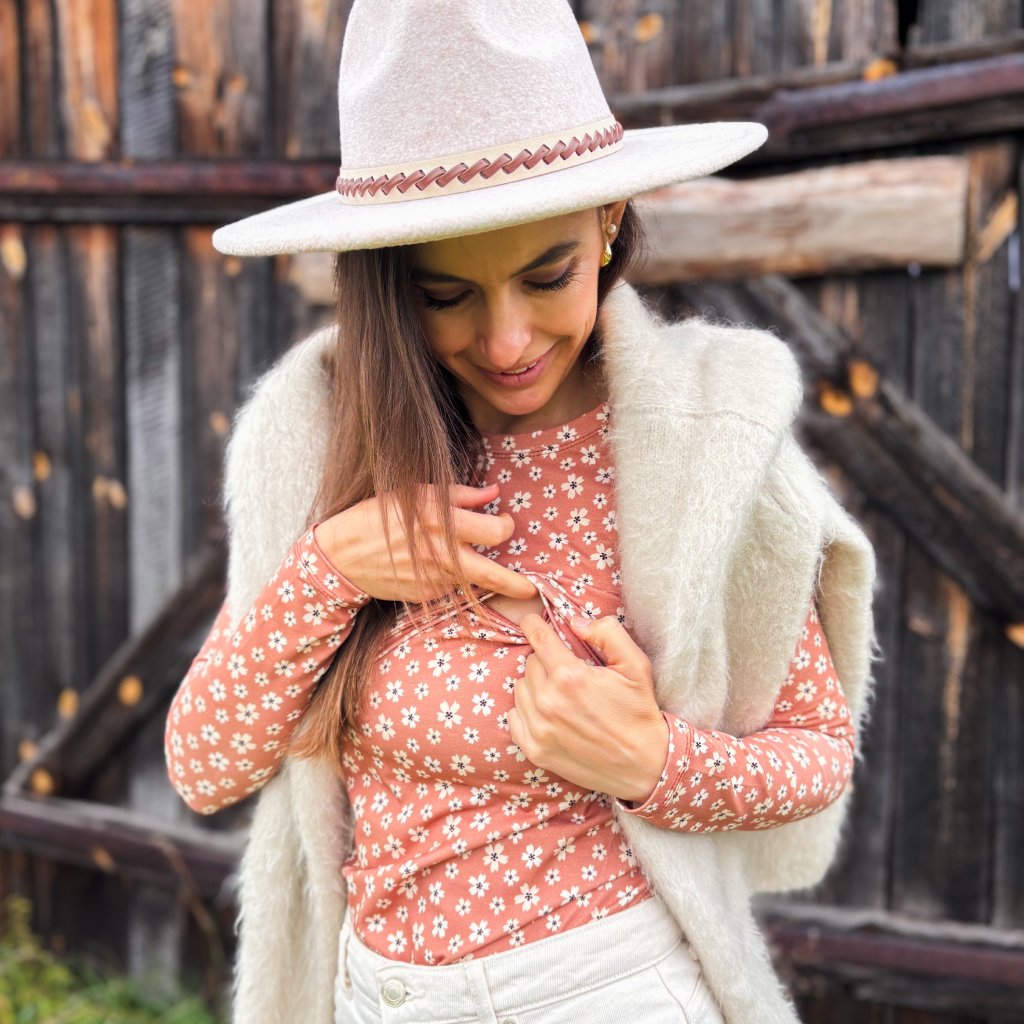 Tričko na dojčenie je navrhnuté tak, aby ste v ňom mohli jednoducho a diskrétne nadojčiť Vaše dieťatko. Vďaka prestrihu pod prsiami je dojčenie praktické aj keď nosíte svoje dieťatko v nosiči, alebo šatke.