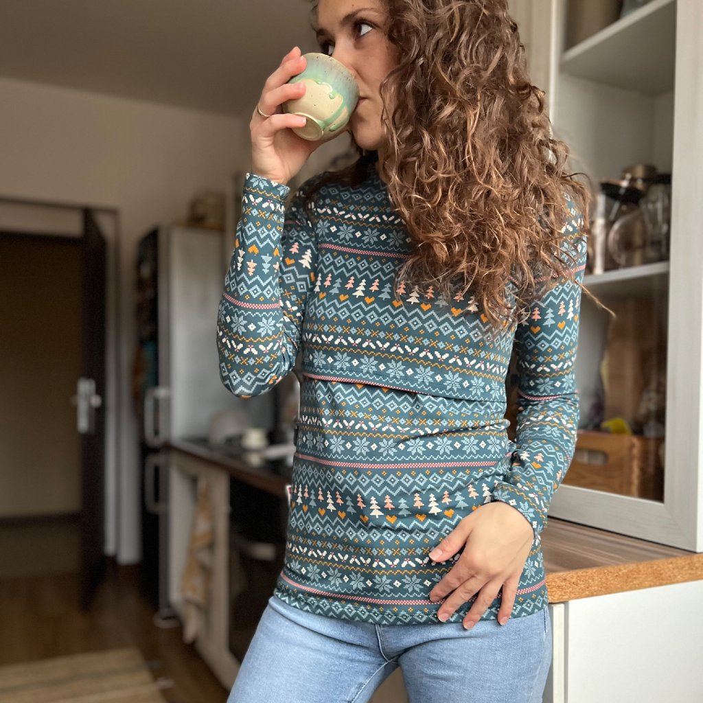 Tričko Vám ušijeme s 3/4, alebo dlhým rukávom. Objednať si môžete verziu na dojčenie, alebo nedojčiacu verziu.
